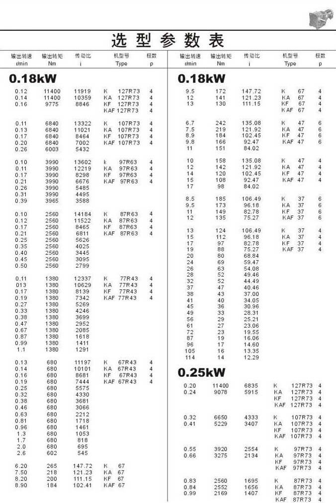 選型參數(shù)表0.18kW和0.25kW